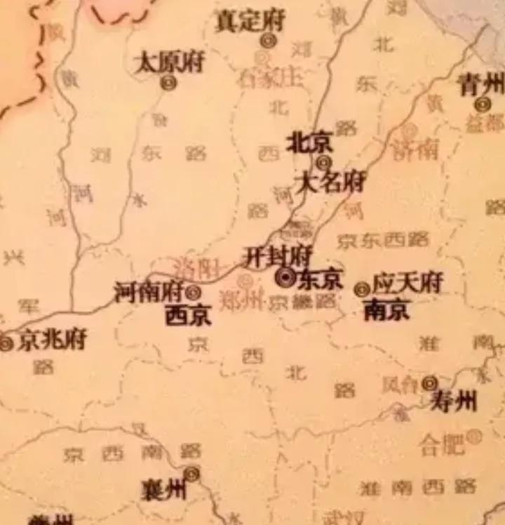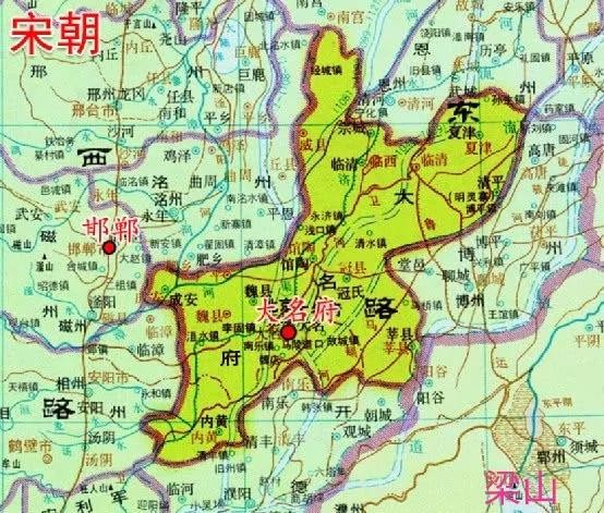 北宋定都开封府,称为东京,同时确定三个陪都,即西京河南府(洛阳),南京应天府(商丘),北京大名府。这就是北京大名府的来历,并不是今天的北京。同时大名府还成为河北路治所。大名府治元城、大名县(一个府有两个附郭县),领元城、大名、莘县、内黄、成安、魏县、馆陶、临清、夏津、清平、冠氏、朝城、南乐、洹水等县(其中莘县、冠氏、清平、朝城、临清、夏津现属山东,馆陶县也曾属山东)。