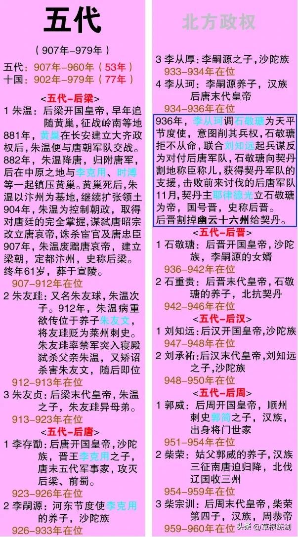 3. 石敬瑭:后晋的开国皇帝,原是后唐的将领,为了夺取皇位,他向契丹求援,割让燕云十六州,并认契丹皇帝为父,自称“儿皇帝”。