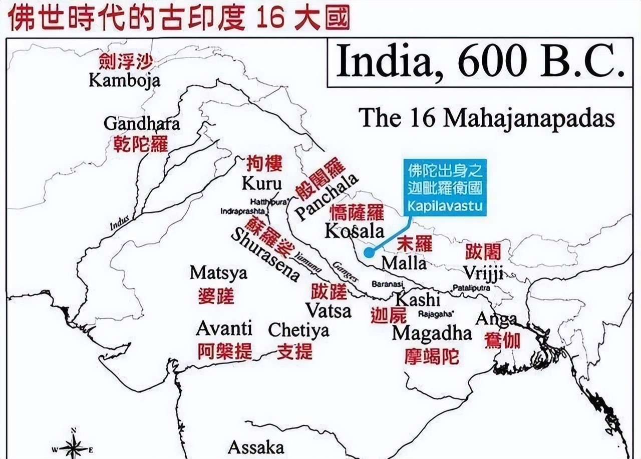 十六雄国是:迦尸、憍萨罗、鸯伽、摩揭陀、弗栗恃(跋耆)、末罗、支提、跋蹉、俱卢、般遮罗、摩差耶、修罗色那、阿湿波、阿槃底、犍陀罗和甘菩遮(剑洴沙)。
