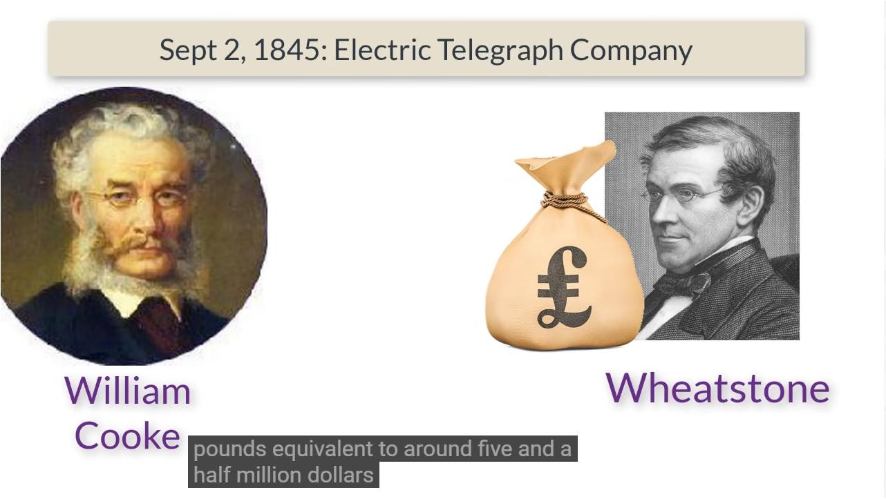 一年后正当库克他们与电报公司合作的时候,那位亚历山大·贝恩,还记得吗,他发了一封请愿书,状告惠斯通偷窃了它的电子钟和电报机设计,英国上议院一位成员认为贝尔的工作具有重要价值,公司理应给予他奖励。公司的确后来支付给贝尔一笔费用,同时也雇佣贝恩在公司里工作。公司也聘请了一位名叫亨利·梅普尔的人,这个人也声称惠斯通窃取了他的设计。为此惠斯通愤怒从公司离职。