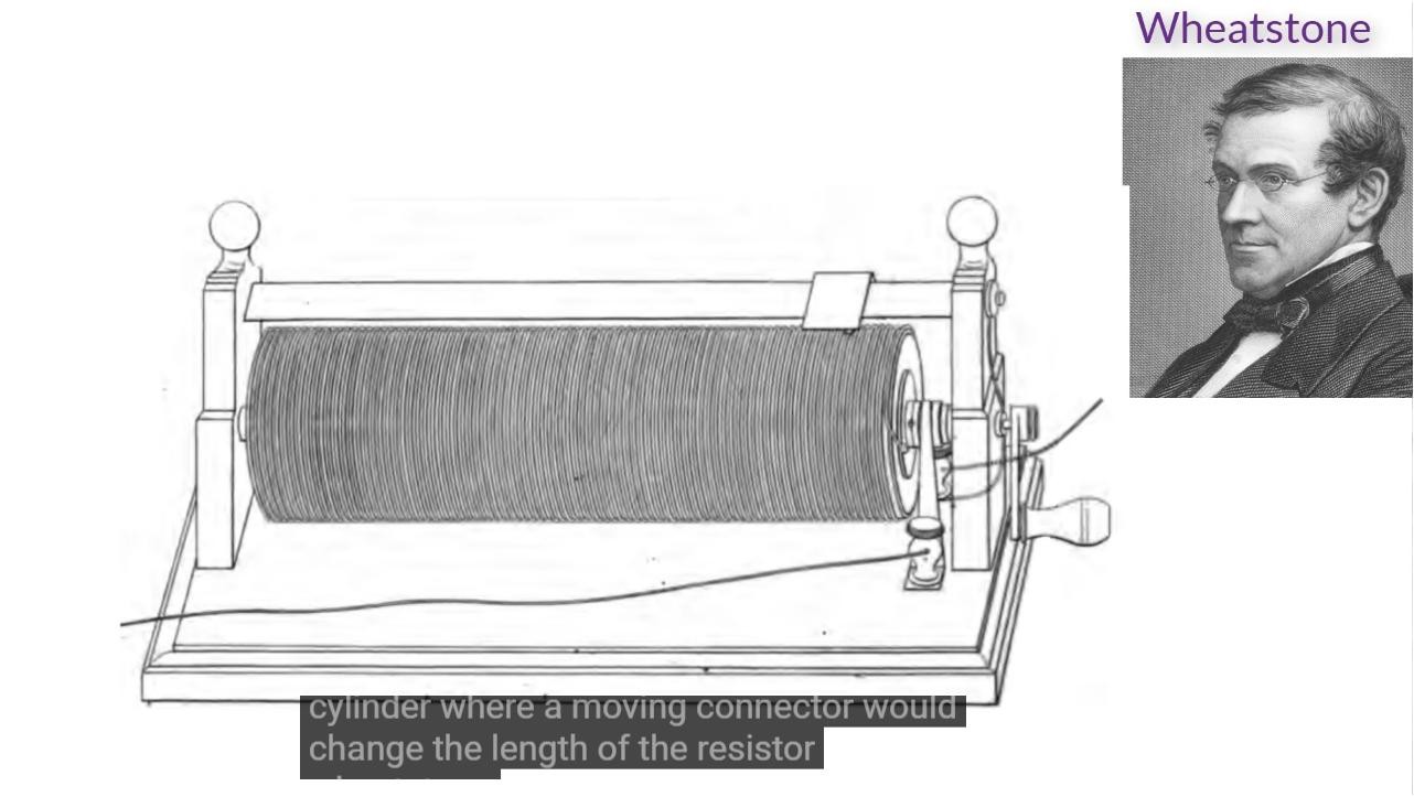第二个方案是使用一个大的绝缘圆柱缠绕表面绝缘的金属线,通过改变连接触点的位置来改变电阻。惠斯通将这两种方案为变阻器。这个名称被使用了很多年,如今也被使用。可变电阻用于控制电路中的电流。