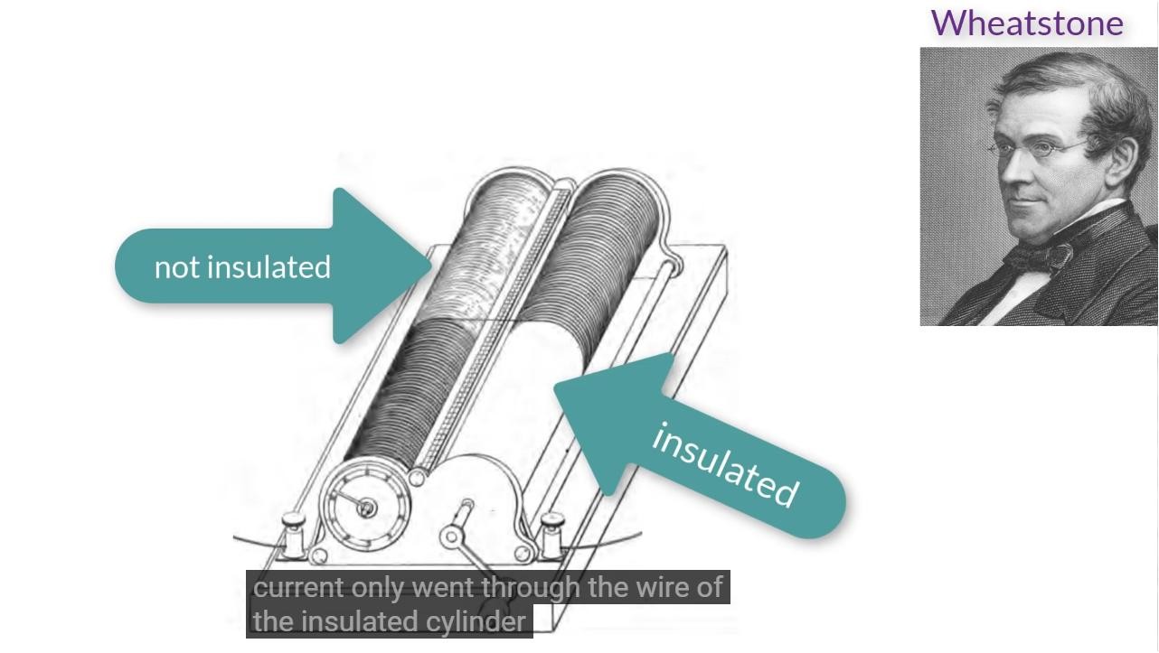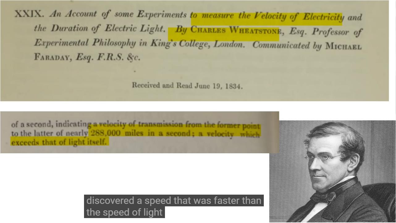 在克里斯蒂发在1834年发表演讲之后的一年,32岁的查尔斯·惠斯顿设计一个新的方法来测量电线中的电流传播速度。通过一个旋转镜片观察一个很长距离之外电线产生的电火花。那个时候人们认为电线中电的传播是瞬时的,对电的传播速度依赖于导体特性的结果感到非常惊奇。