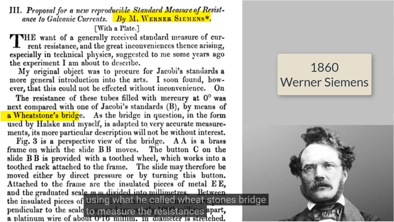 这篇文章中,西门子说他利用了惠斯通电桥来测量电阻, 由于他是德国人,他也许不知道克里斯蒂。这篇论文在一个月后被翻译成英语,文中人们第一次使用了惠斯通电桥这个名词。西门子的弟弟几周后到英国同样使用惠斯通电桥。西门子提出使用一段水银来作为电阻测量标准最终被抛弃了,后来使用一伏电压除以一安培电流来定义一欧姆。正式西门子的论文使得惠斯通电桥流行起来,无论是惠斯通的名声还是电桥设备。