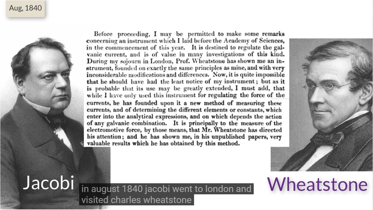 你知道雅克比在1834年就推广欧姆定律,并在1838年将其著作翻译成英语。惠斯通则是在1840年之后开始推广欧姆定律,并在那个时期他使用了雅克比可变电阻来测量电阻,但他一直没有提起如何从雅克比那里学习的相关内容。