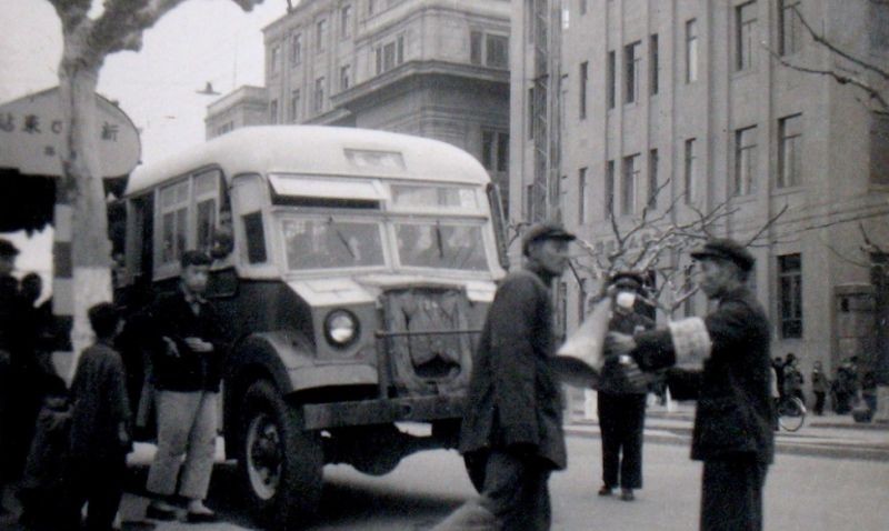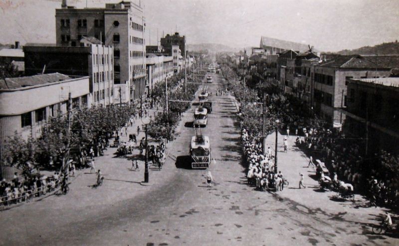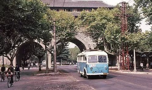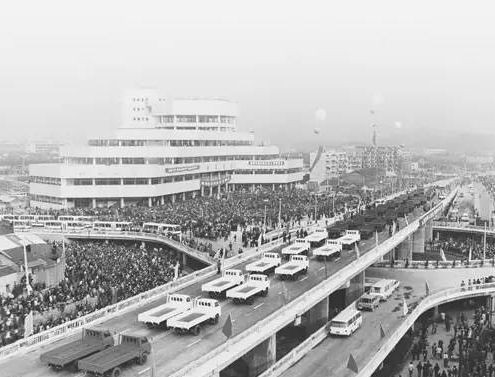 1960年8月1日南京公交无轨电车开通时,行驶到新街口的首辆彩车。