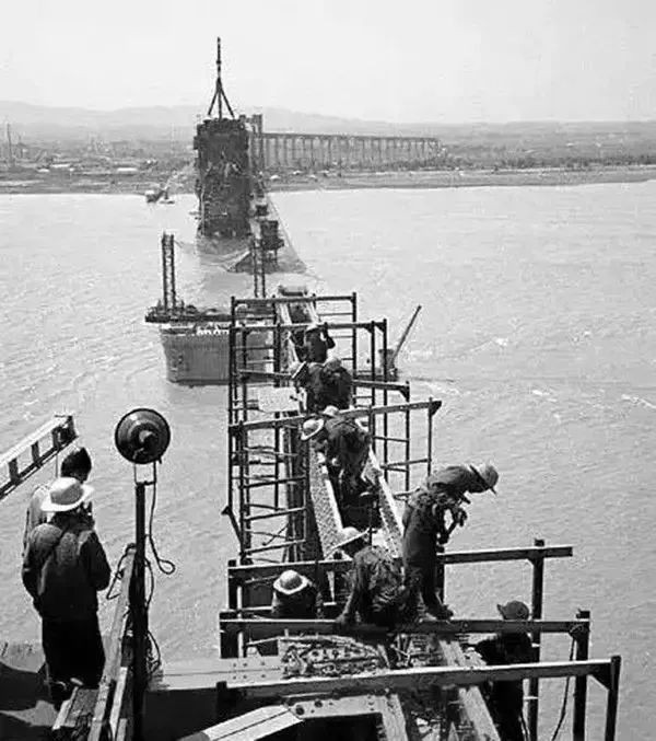 1967年,建设南京长江大桥的工人在高空架设钢梁。
