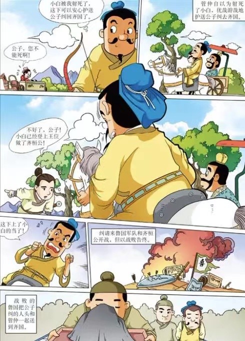 不久,齐国内乱,管仲和公子纠找到鲁国国君,请他派军队护送回国,日后必定重谢,鲁庄公满口答应。就在这时,鲍叔牙和小白也找到了举国国君,请求帮助,举国虽国力弱小,但国君很讲义气,也同意护送回国。
