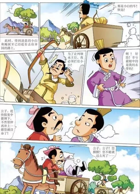 公子小白一声惨叫,一口鲜血喷出,当场倒地,众人目瞪口呆,还没回过神儿来,只见管仲得意大笑一声,翻身上马,扬长而去。当众人终于清醒过来,鲍叔牙抱头痛哭,谁料地上的公子小白突然坐了起来,解释道刚才那箭射中了衣带钩,自己趁机咬破舌头糊弄管仲。