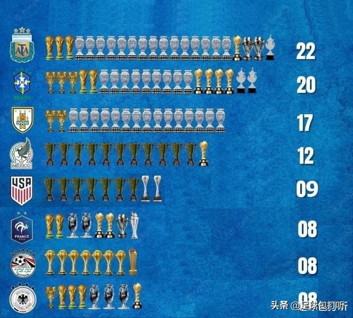 阿根廷是15个美洲杯、3个世界杯、1个联合会杯、2个欧美超级杯、1个泛美金杯。巴西是5个世界杯、4个联合会杯、9个美洲杯、2个泛美金杯。乌拉圭是15个美洲杯和2个世界杯。