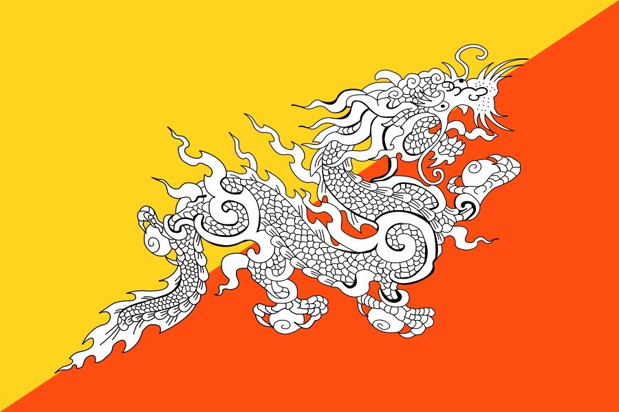 国旗由一个红色和黄色的三角形作背景,再加上一条白龙,龙象征王室权威,背景的两种颜色是表示了不丹以佛教为国教,龙身上的白色象征了“忠诚和纯洁的礼赞”,而龙旁边的四颗白珠有威力和圣洁之意。下面的图是现行国旗的变种,也许是为了更中国化?