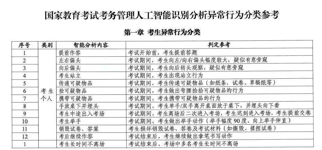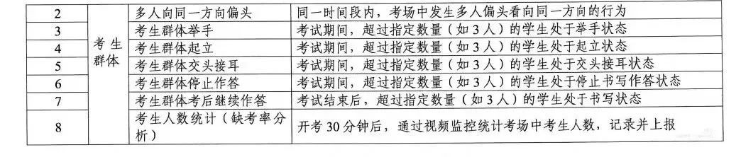 武汉、宜昌、襄阳、荆州、黄冈等地试点应用考场行为智能巡查系统,充分利用技术手段快速发现和处置考场异常行为。湖北升学通整理考场异常行为如下图: