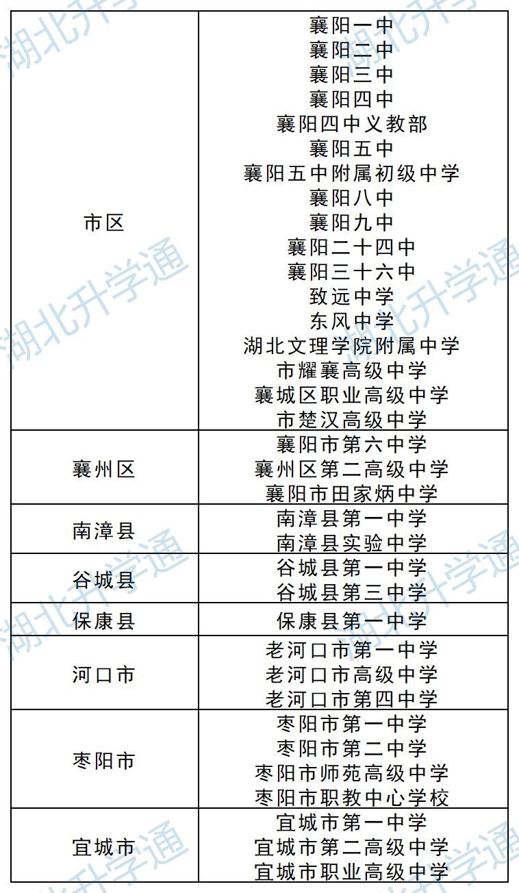 郧阳区设3个考点(郧阳区第一中学、郧阳区第二中学、郧阳区科技学校);丹江口市设2个考点(丹江口市第一中学、丹江口市汉江科技学校);郧西县设2个考点(郧西县第一中学、郧西县职业技术学校);房县设1个考点(房县第一中学);竹山县设2个考点(竹山县第一中学、竹山县职业技术集团学校);竹溪县设2个考点(竹溪县第一高级中学、竹溪县职业技术学校)。