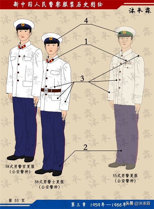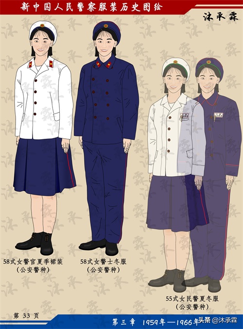 58式警服服装制式具体规定:春夏秋三季,户籍、交通、铁路等公安警种上衣为漂白色,裤和裙均为藏蓝色。男上衣为小立领,四个暗口袋。下装为西式裤,两侧镶红牙线;女上衣为大翻领,下侧两个暗袋,西式裤和裙子,两侧镶红牙线。男女民警夏季套白色帽罩。