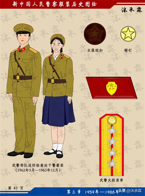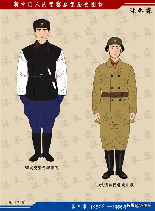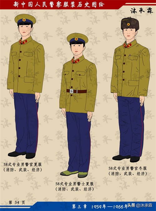 1959年5月19日公安部发出通知,自1959年10月1日起全国武警部队换装58式专业警种警服。干警和警士均在警裤缝线上按各自级别镶红色平布牙线区分级别,具体如下:处以上干警镶7毫米的裤缝线,科以下干警5毫米裤缝线,警士为2毫米。干警、警士着夏服时均戴大檐帽,冬帽为棕绿色栽绒棉帽。