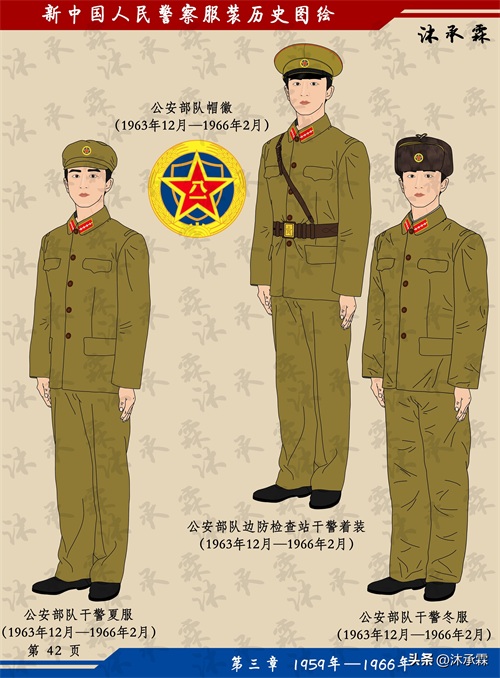 1963年12月9日,经中央批准,公安部队将现行的帽徽、符号式样改为在陆军帽徽“八一”红星后镶加公安盾牌,为公安部队帽徽;符号采用原公安军时期的符号,衣服钮扣、肩章扣、腰带钎子以及士兵超期服役证章均与解放军相同。这时期的中国人民公安部队除去帽徽为新设计的样式,并沿用55年公安军时期的领章符号外,其他和陆军着装完全一致,边防检查站干警执勤时佩戴大檐帽,扎武装带。