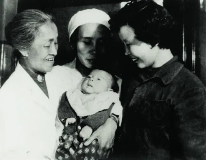 林巧稚(左一)抱着全国第一例抢救成功的新生儿溶血症患儿