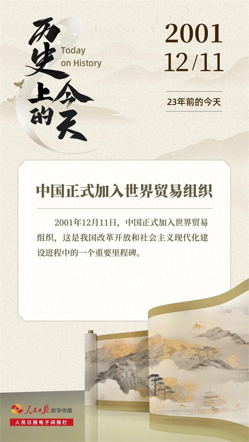2001年12月11日,中国正式加入世界贸易组织,这是我国改革开放和社会主义现代化建设进程中的一个重要里程碑。