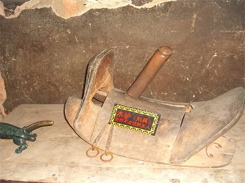 另外还有所不同是长木板中间有一个突起的圆木棍,圆木棍的长度短则10多厘米,长则30多厘米,其作用就是在执行刑罚过程插入女子下体的。