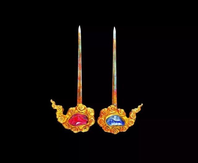 金镶宝王母骑青鸾挑心,在明益宣王夫妇墓出土,属于继妃孙氏的一件金镶宝王母骑青鸾挑心中,王母娘娘正驾凤而来 。现于江西省博物馆藏。