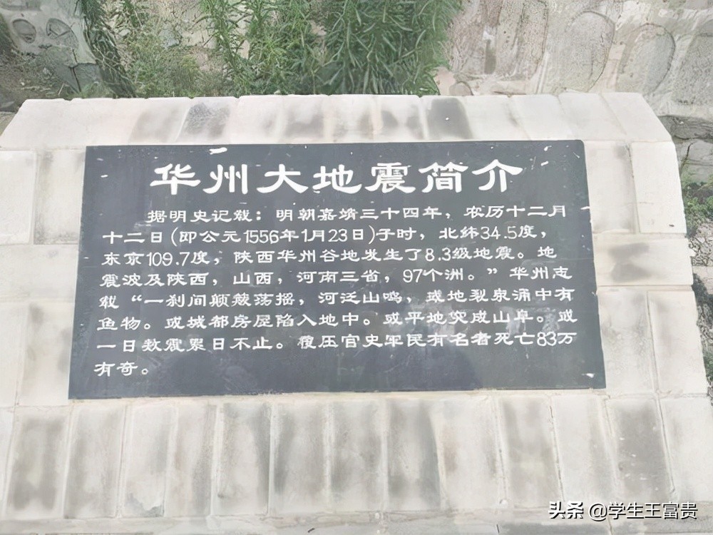 陕西华县地震发生于明嘉靖三十四年十二月十二日 (1556年1月23日)。地震波及陕西、山西、河南、甘肃、河北、山东、湖北、湖南、江苏、安徽等11省130余县,有的县整个陷落下去。此次地震,死亡人数有姓名记载的就超过83万,不知名的死者及未经奏报的死者更是不计其数,这是中国历史地震中死人最多的一次地震,为世界地震死亡人口之最。“官吏军民压死八十三万有奇”(《明史·五行志》)。地震前,该地区长期没有中小地震活动。但震前8小时左右,在震中区有“地旋晕,因而头晕”(《隆庆·华州志》)的记载。这次地震首次记载到地震时“地中出火”(地光)的现象。根据关于这次地震的记载,现在普遍认为这次地震的强度高达8.3级。