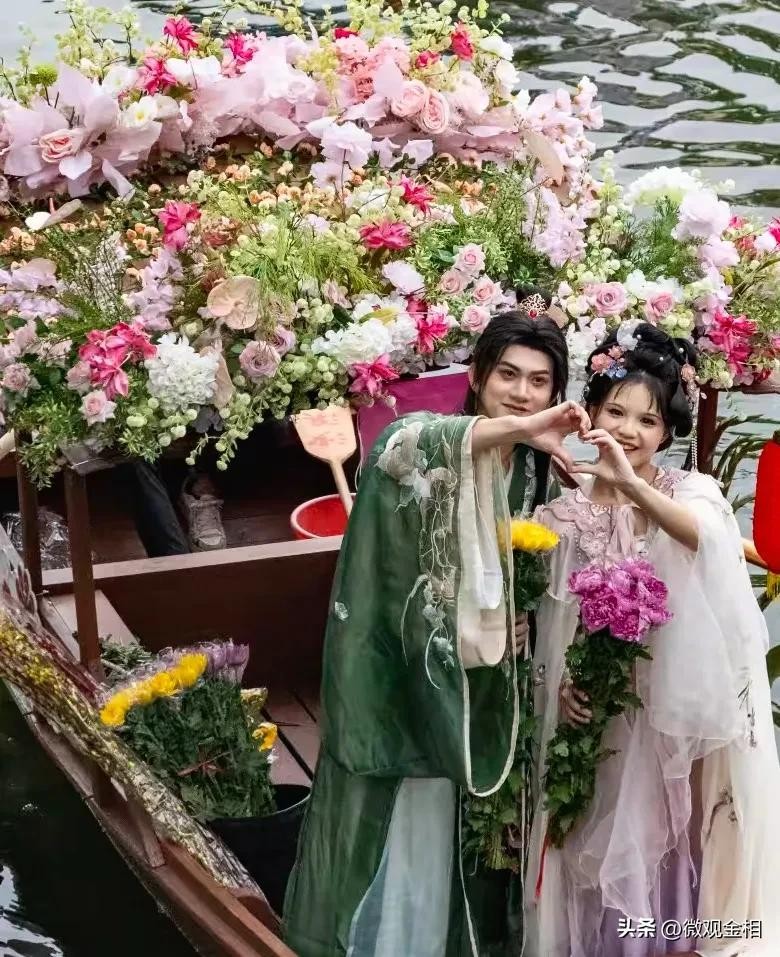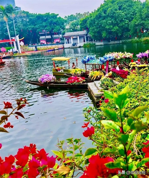 荔湾湖公园体验水上花市,很有意思。荔湾湖公园,波光粼粼的湖面上,满载着鲜花的复古木船内,身着汉服的“卖花郎”“花仙子”正站在船头一角,手捧着娇艳欲滴的百合、牡丹、康乃馨等多种鲜花,大声吆喝售卖。