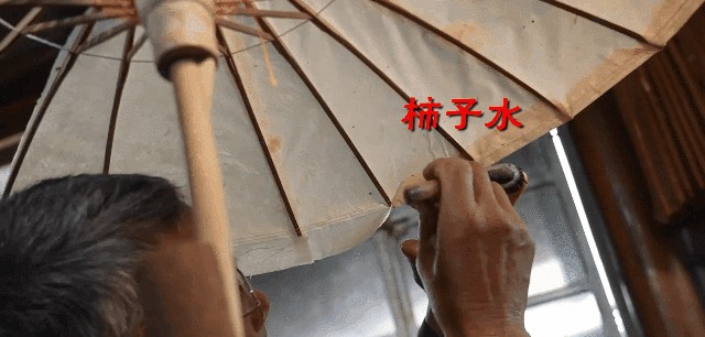 接下来,就是伞面了,在糊纸的过程中,会用到柿子水,即:把柿子捣烂后榨出的“柿漆”,它粘伞不坏纸,能起到“胶水”的作用;