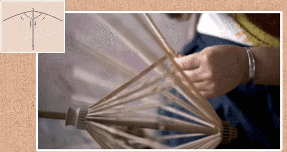 接下来,就是将长伞骨与短伞骨相连了,先把短伞骨的一端按入槽中,然后,再穿线固定。