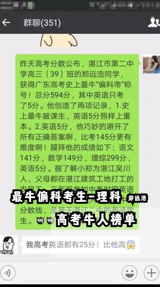 第五位、史上最牛高考偏科状元--理综状元,郑远浩被冠以“偏科帝”称号,总分590分,语文140,,数学146,理综299!英语5分。