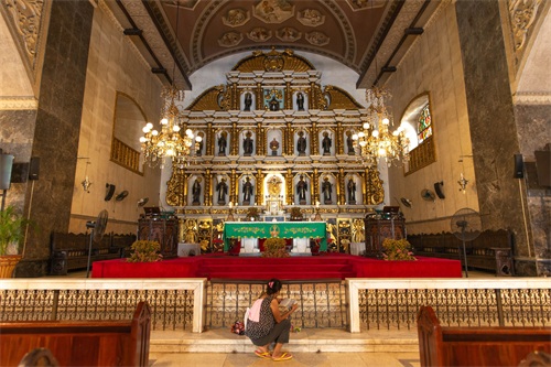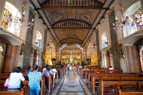 圣婴教堂采用了典型的欧洲建筑风格,白色的教堂外有各种天主教神明的圣像雕塑,造型栩栩如生。进入内部之后,木质的长椅发出淡淡的时间光芒,色彩斑斓的彩色玻璃窗,精致的水晶吊灯,华美的壁画,彷佛就是到了欧洲教堂。虽然没有那些欧洲的知名大教堂金碧辉煌,但也充满了庄重感,宿雾给了这里独特的气质。