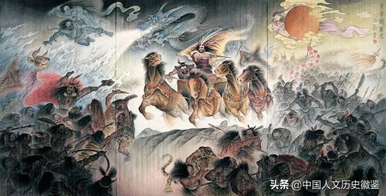 战争过程:当时蚩尤族集结了所属的81个支族(一说72族),在力量上占据某种优势,所以,双方接触后,蚩尤族便倚仗人多势众、武器优良等条件,主动向黄帝族发起攻击。黄帝族则率领以熊、罴、狼、豹、雕、龙、鸮等为图腾的氏族,迎战蚩尤族,并让“应龙高水”,即利用位处上流的条件,在河流上筑土坝蓄水,以阻挡蚩尤族的进攻。