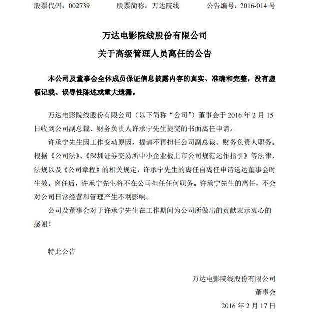 同日,万达院线副总裁、财务负责人许承宁也提交书面离任申请,公告称许承宁因工作变动原因,提请不再担任公司副总裁、财务负责人职务,并将不在公司担任任何职务。