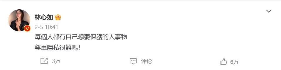 2023年2月5日,林心如在自己的WEI博上发了这样一段话