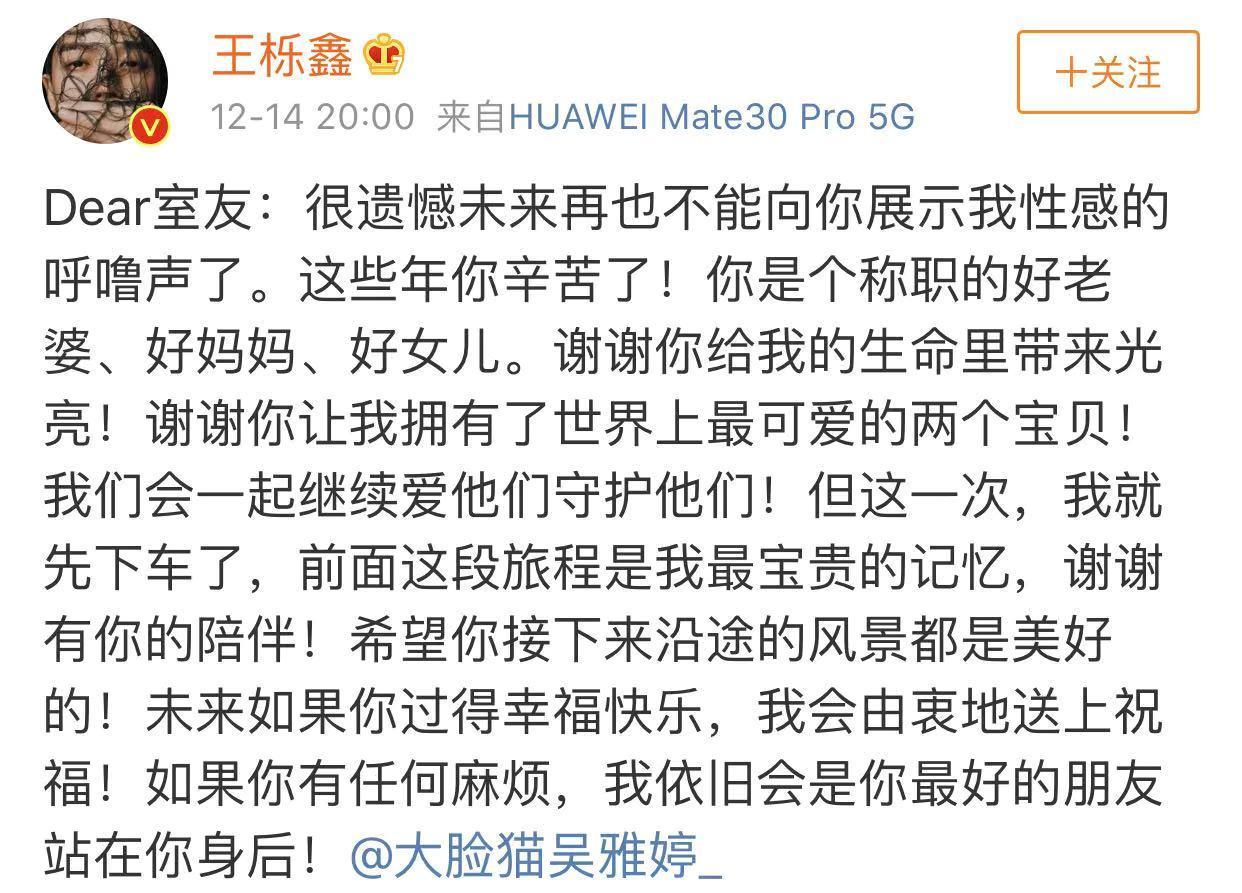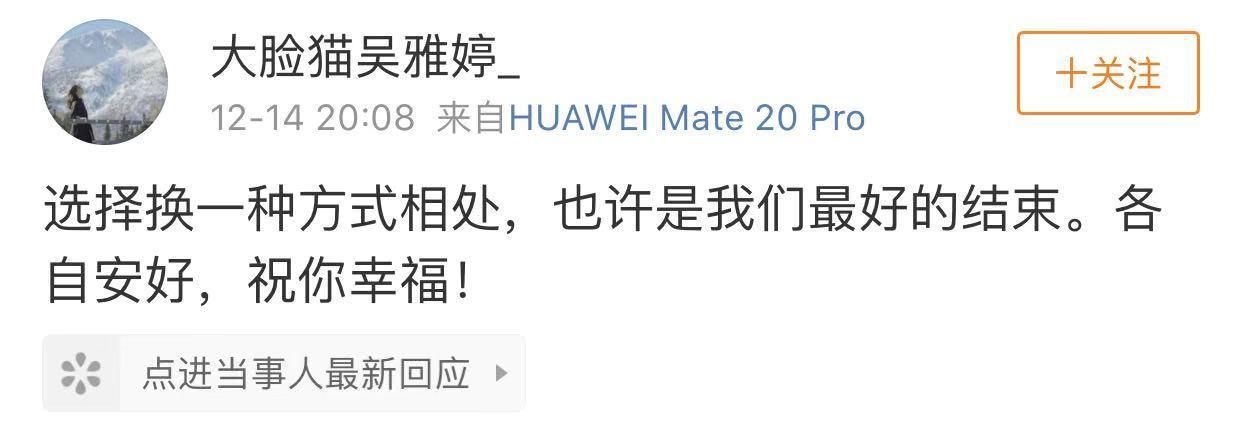 王栎鑫发了一长段文字,扔下了这颗重磅炸弹,几分钟后,吴雅婷方也作了回应。