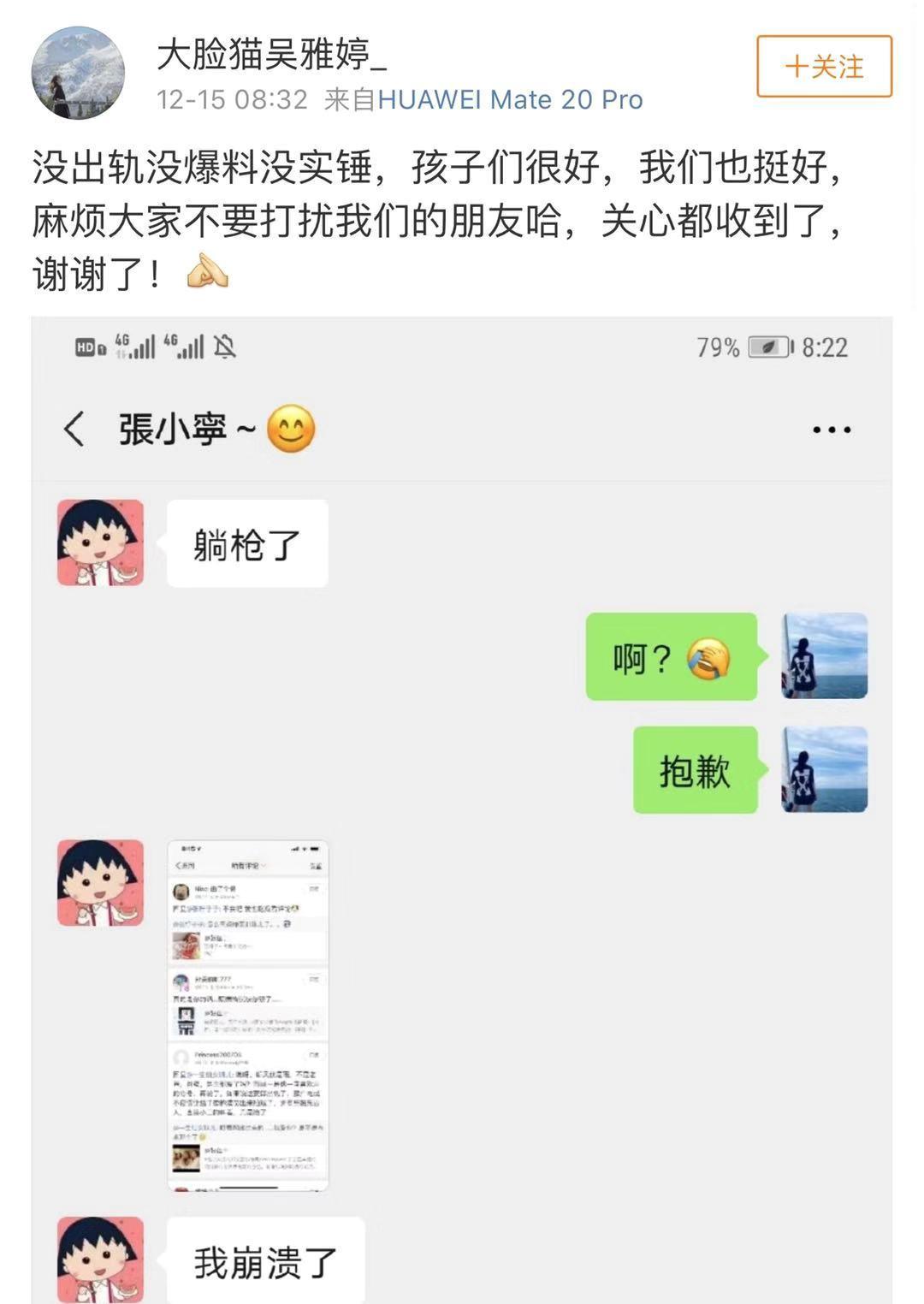 结果第二天早上8点,朋友张佳宁被“波及”了,吴雅婷暂时放下了离婚的伤痛,第一时间出面为张佳宁澄清。