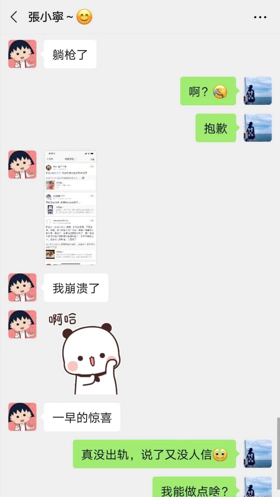 从晒出的聊天记录中,能看出是张佳宁先找了吴雅婷,她说自己“躺枪了”、“我崩溃了”,并且给吴雅婷看了出轨介入的传闻截图。
