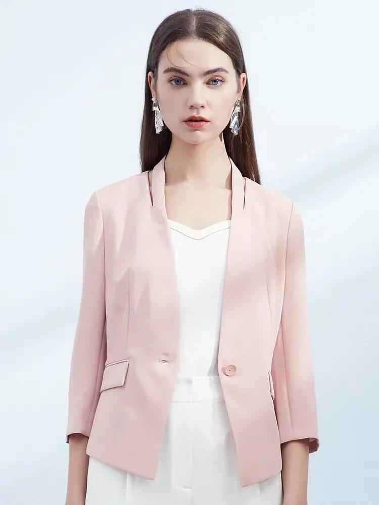 颜色搭配上基本不用操心,只需要选一款合适的皮粉色西装外套,白色的内搭,可以是针织衫、T恤、缎面吊带等。