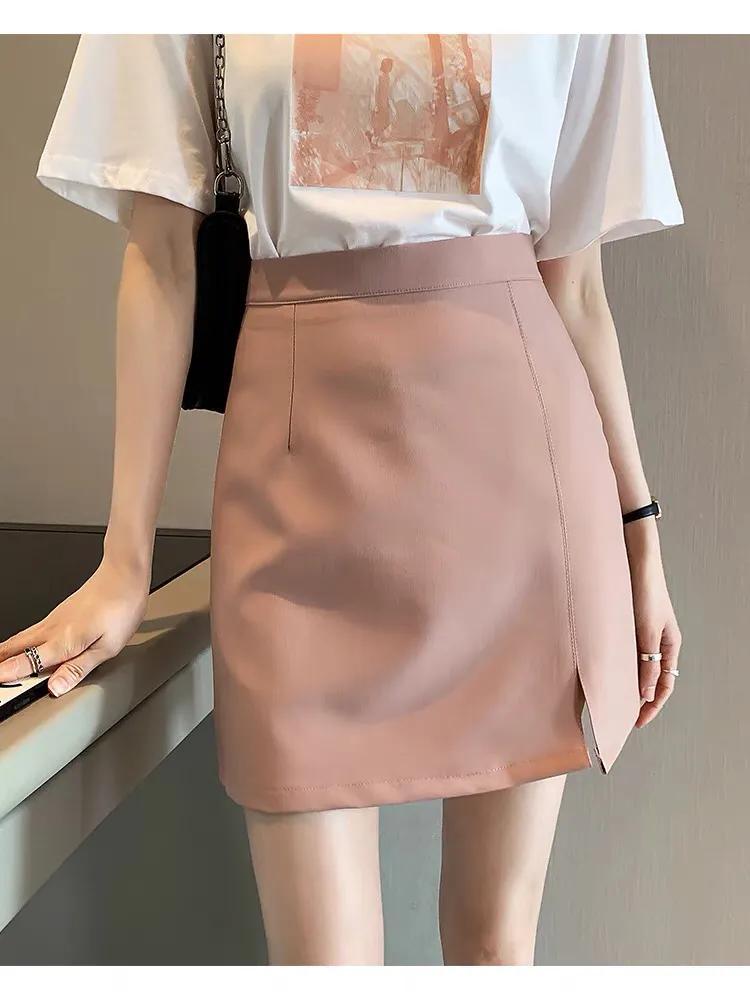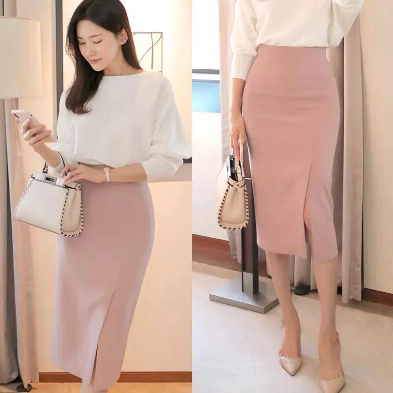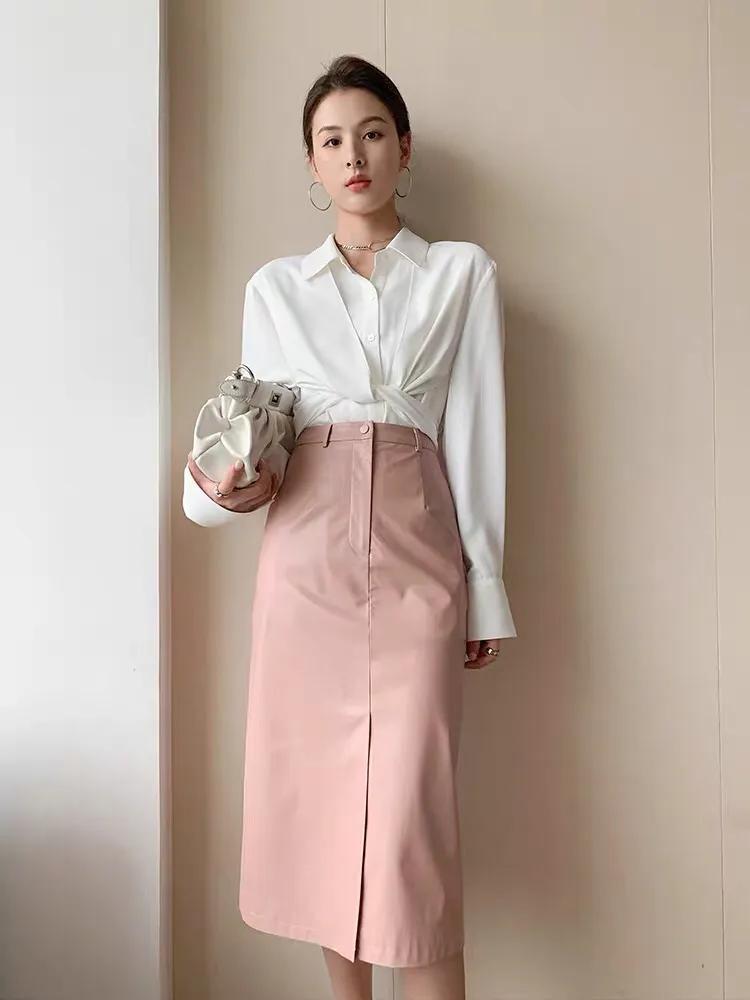 另外白色衬衣+中长款的皮粉色半身裙,ol职业装的选择,穿起来显得成熟优雅,丝毫没有粉色的少女感。