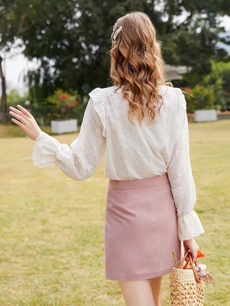 白色蕾丝衬衣,有少女的俏皮感,有轻熟女的性感,在一件蕾丝衬衣上展露无遗,搭配一件半身裙,牛仔材质,却是皮粉色的半身裙。