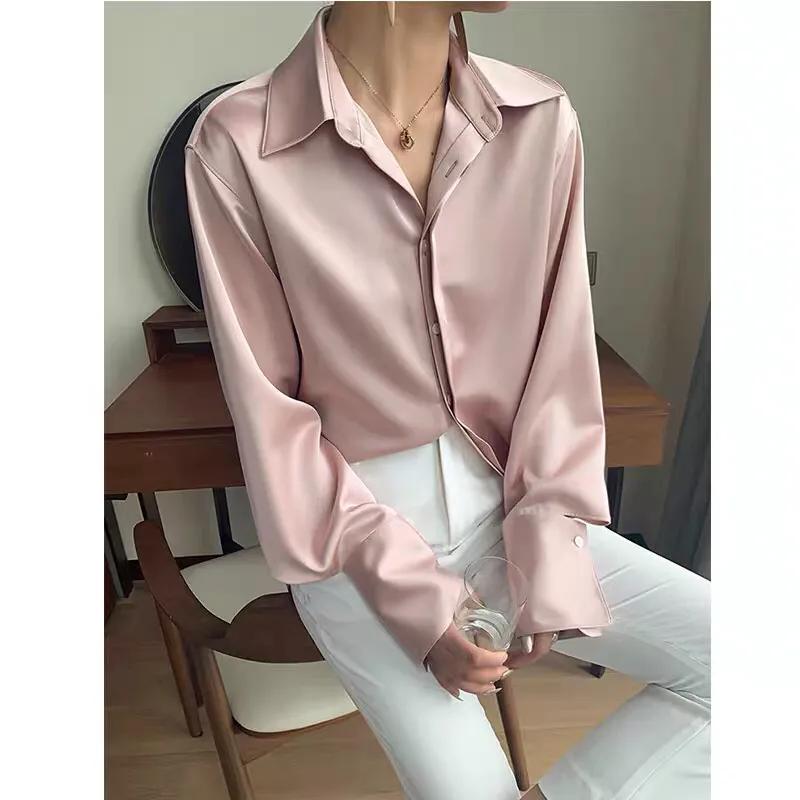 如果上前面是上白下皮粉色的穿法,那么皮粉色缎面衬衣+白色长裤,就属于上皮粉下白的穿搭。