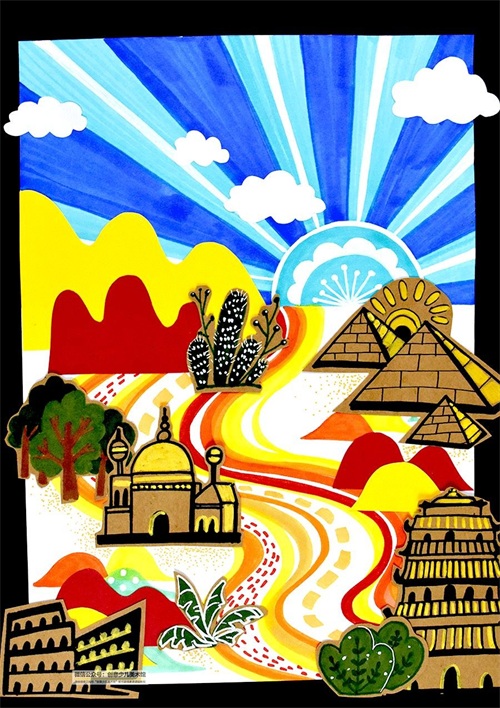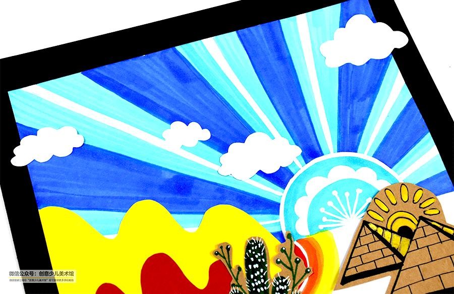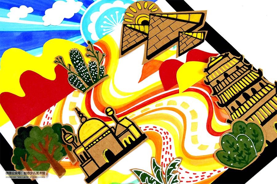 在画面中,运用卡纸剪贴的方式来表现丝绸之路中有名的城市建筑,抓住不同建筑的外形特点,用剪刀剪下来粘贴在卡纸上,培养小朋们的构图能力。
