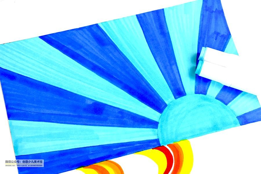选择深浅不同的蓝色水彩笔对画面中天空涂上颜色