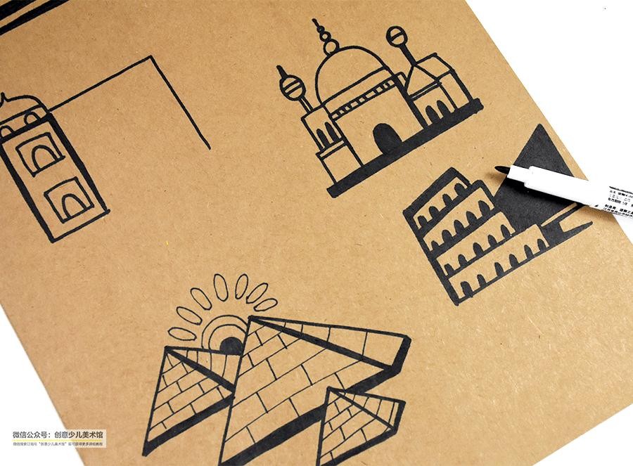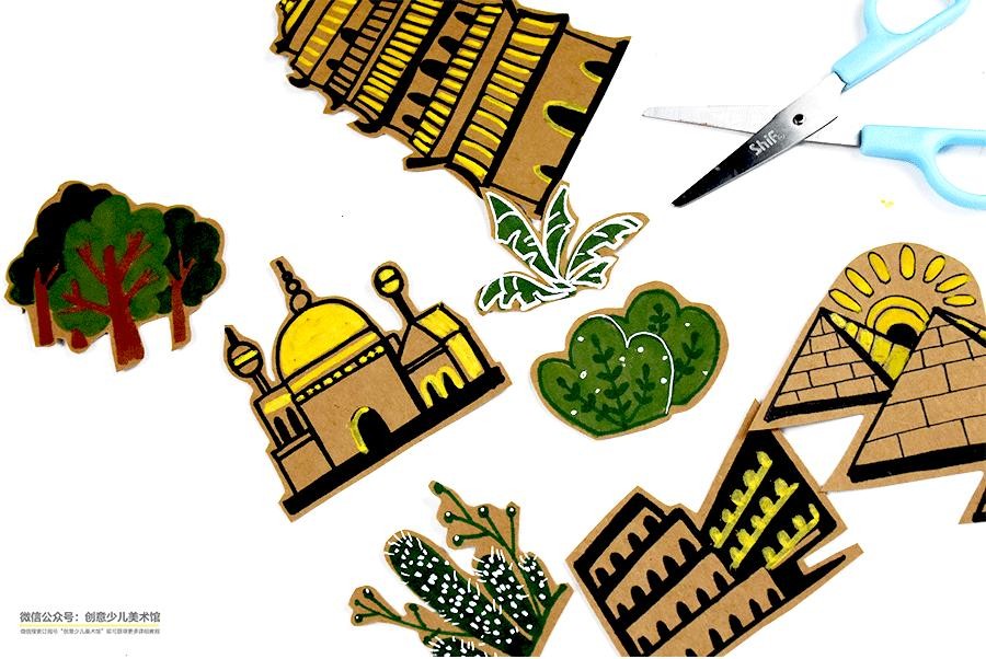 1、通过观察和参考图片素材,运用卡纸剪贴的方式来表现丝绸之路上有名的建筑。