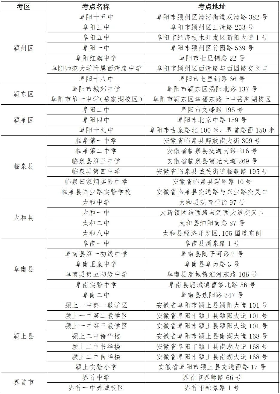 阜阳市2024年高考考点设置表