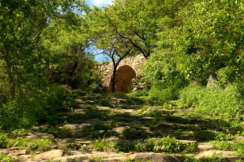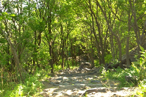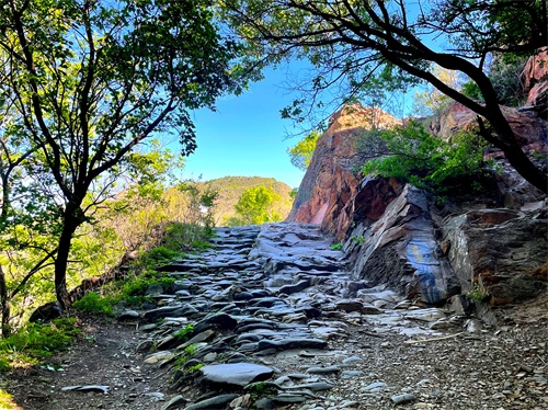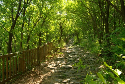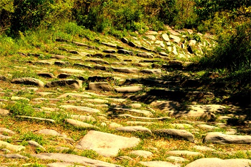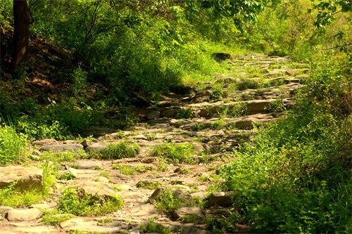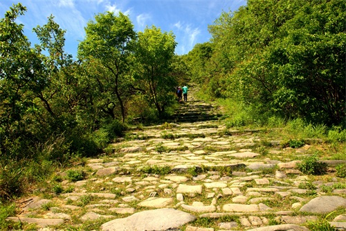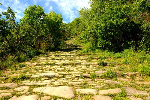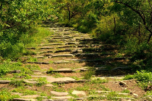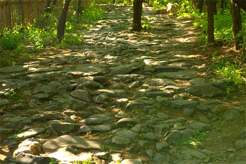 沿古道由西向东爬行。蜿蜒曲折,崎岖不平。山间万木争荣,绿意葱茏。早晨的阳光还不是太热,山风吹过,凉风习习。古道荒芜败破,草木杂陈,但所经之处,木秀林茂,繁花点点。脚下是记载着数百年来北京和河北、山西、内蒙古的商贾往来、内外通衢的古道。虽然历经数百年,但古道用石尽管大小不一、方圆不均、高低不平,但块块坚实稳固,无序中有序,铸就了古道的沧桑历史。这些古道大都是商道,也有兵道、香道。山西、内蒙古、河北等地的物资,源源不断地通过此处,运输到北京。北京的特产如怀柔板栗和“皇帝诏曰”的公文告示以及精品艺术、学术思想、潮流时尚,则通过京西古道,走向西部和北部。