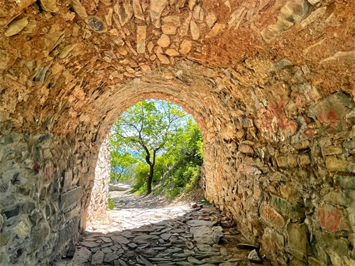黄石港入口有保安拦截,需要扫健康宝,检查48小时核酸后,就可以进入古道了。入口处有三条路,左边是相对比较宽、可以行车的随时路,据保安讲,可以直接到瓜草地;右手边一条小路,可以直接到崖边拍摄山景。中间就是进入古道的入口。