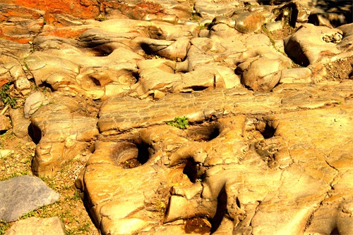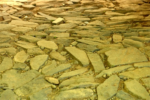 顺着古道由西往东大约步行两三公里,就是京西古道玉河段的精华,号称古道明珠的马蹄窝奇观。这一段削山开出来的路段,长约20米,宽在1.5-2米,全部是一体的沉积细砂岩,石质坚硬细腻,在路面上散步着有清晰的蹄窝百余个,左右交替大致分为两行。据司马迁《史记·五帝本纪》记载,黄帝披山通道之理拓修而成,长19.5米宽不足2亩的山体石道上,因年深日久,碑骡马铁蹄踏出深浅不一的蹄窝印痕150余个,世所罕见,是不可再生极为珍贵的古道文物。