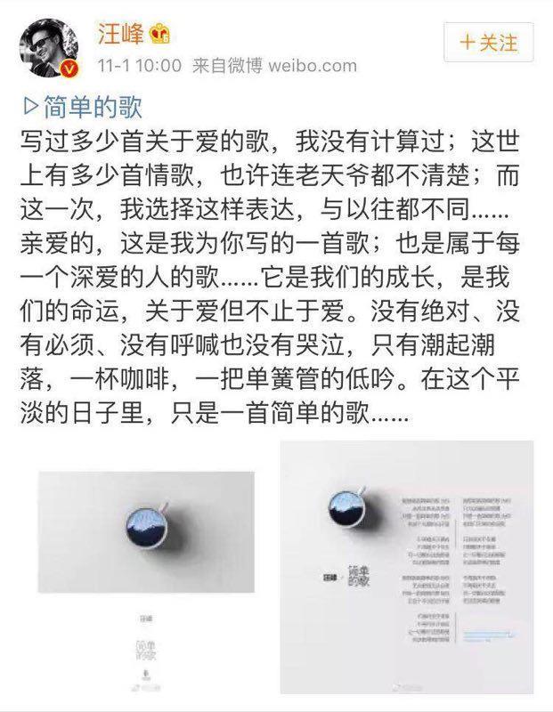 11月1日,汪峰在微博上发布了新歌,名为《简单的歌》。正如他本人的微博中所说的,"这世上有多少首情歌,也许老天爷都不清楚",但他这首歌可以说是最简单却也最富有深意的一首。