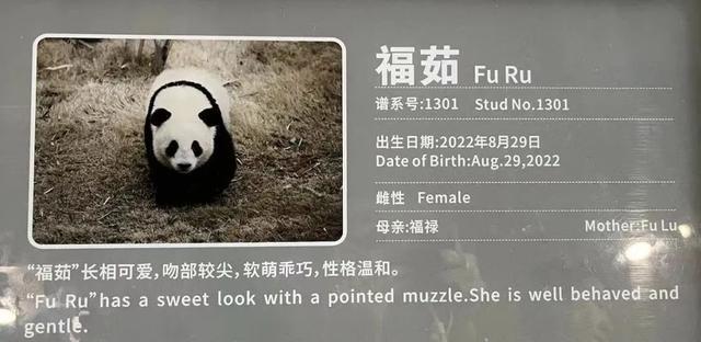 公开资料显示,大熊猫福茹,雌性,2022 年 8 月 29 日出生在成都大熊猫繁育研究基地月亮产房,母亲是大熊猫福禄,姐姐是福双、福菀。来自熊丁兴旺的 " 英英家族 ",外婆瑛华,外公白杨,舅舅福星(胖大海)。