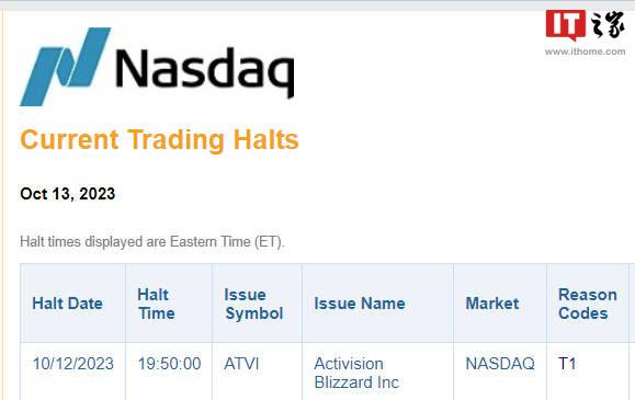 IT 之家 10 月 13 日消息,据纳斯达克官网消息,动视暴雪(ATVI)股票停牌,停牌代码 T1 意为 " 交易暂停,等待重大消息发布 "。