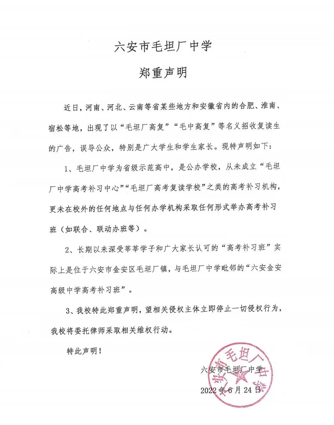 近日,河南、河北、云南等省某些地方和安徽省内的合肥、淮南、宿松等地,出现了以“毛坦厂高复”“毛中高复”等名义招收复读生的广告,误导公众,特别是广大学生和学生家长。现特声明如下: